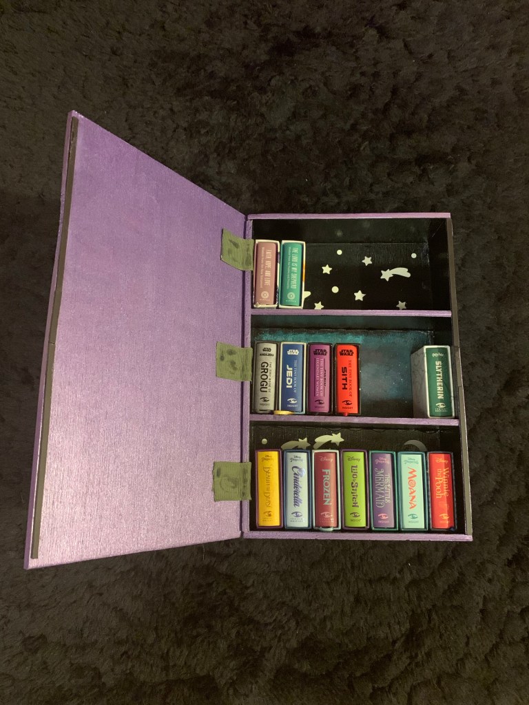 There are small magnets on the edges of the lid and the book ‘pages’ to keep the lid closed, but they aren’t too strong so I still have to be careful!