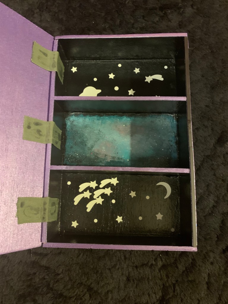You would have noticed the gap in the last pic and you’ll see why here. I used pieces of fabric to secure the lid/cover to the main body of the book. I couldn’t find any small hinges made in the U.S. so tried this in lieu.