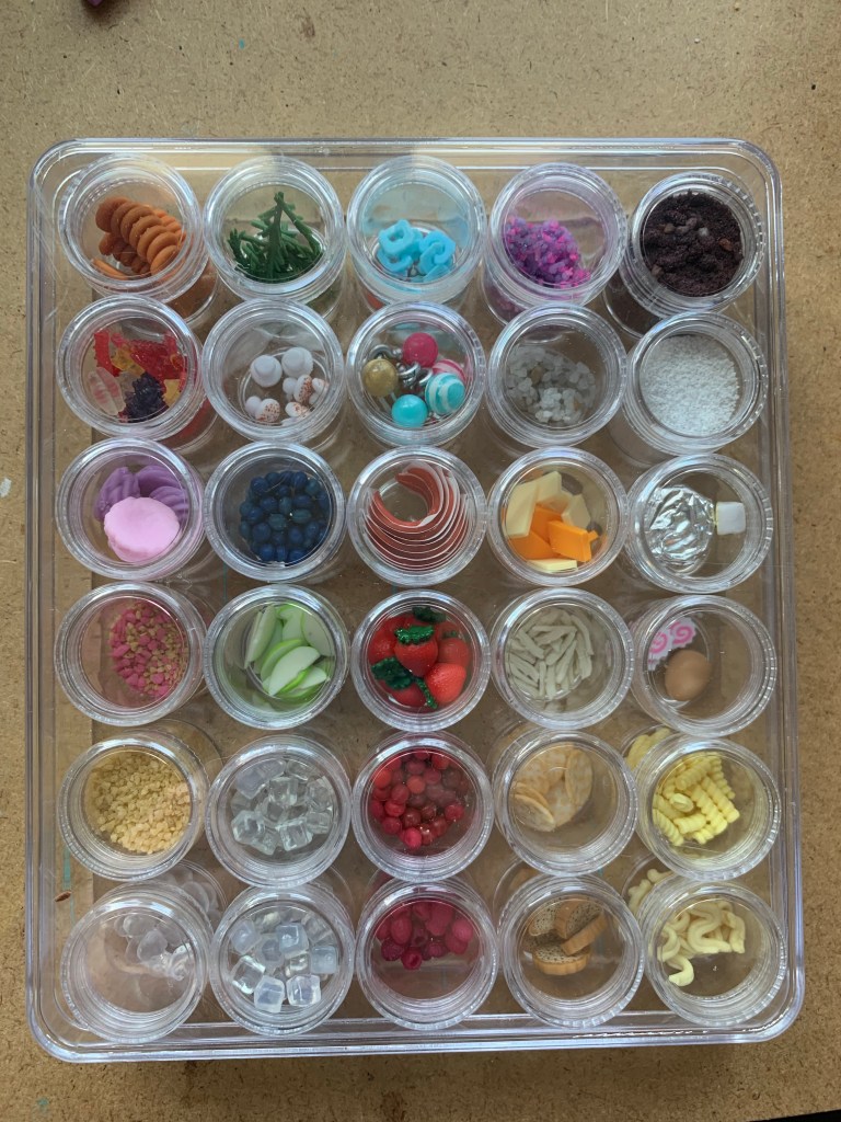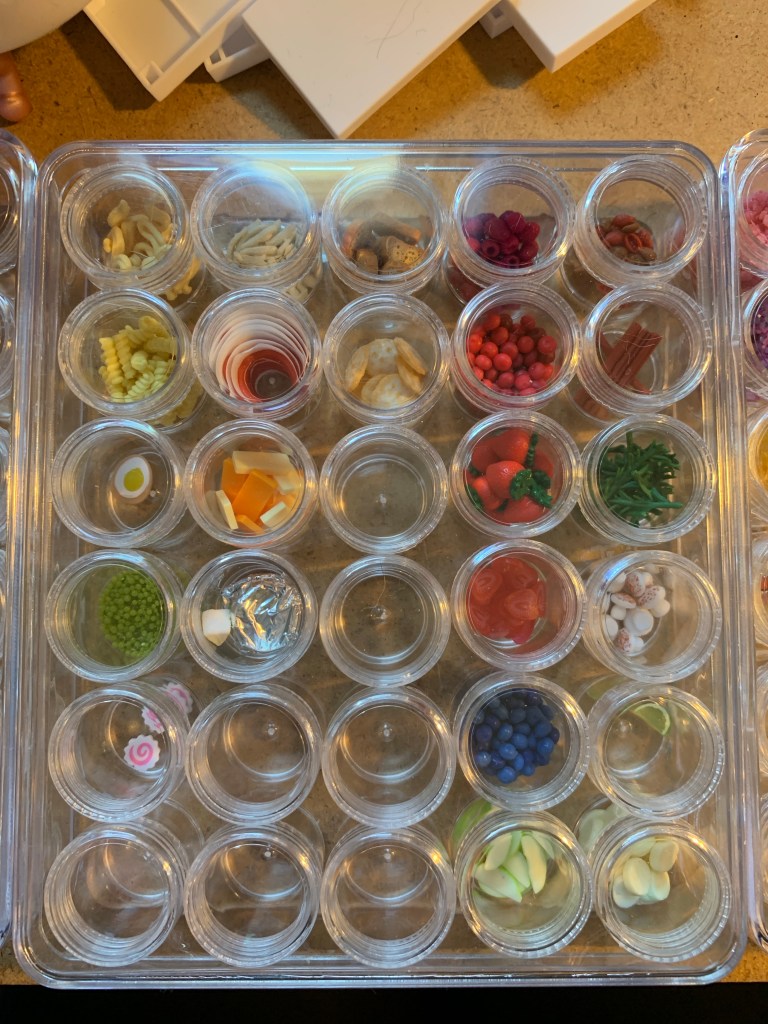 Reorganized into categories per container. This one’s regular food.This one’s snack/sweet foods and ice.This is the non-food one. Organized by fish, flora, misc, fiber and those tiny bag things.