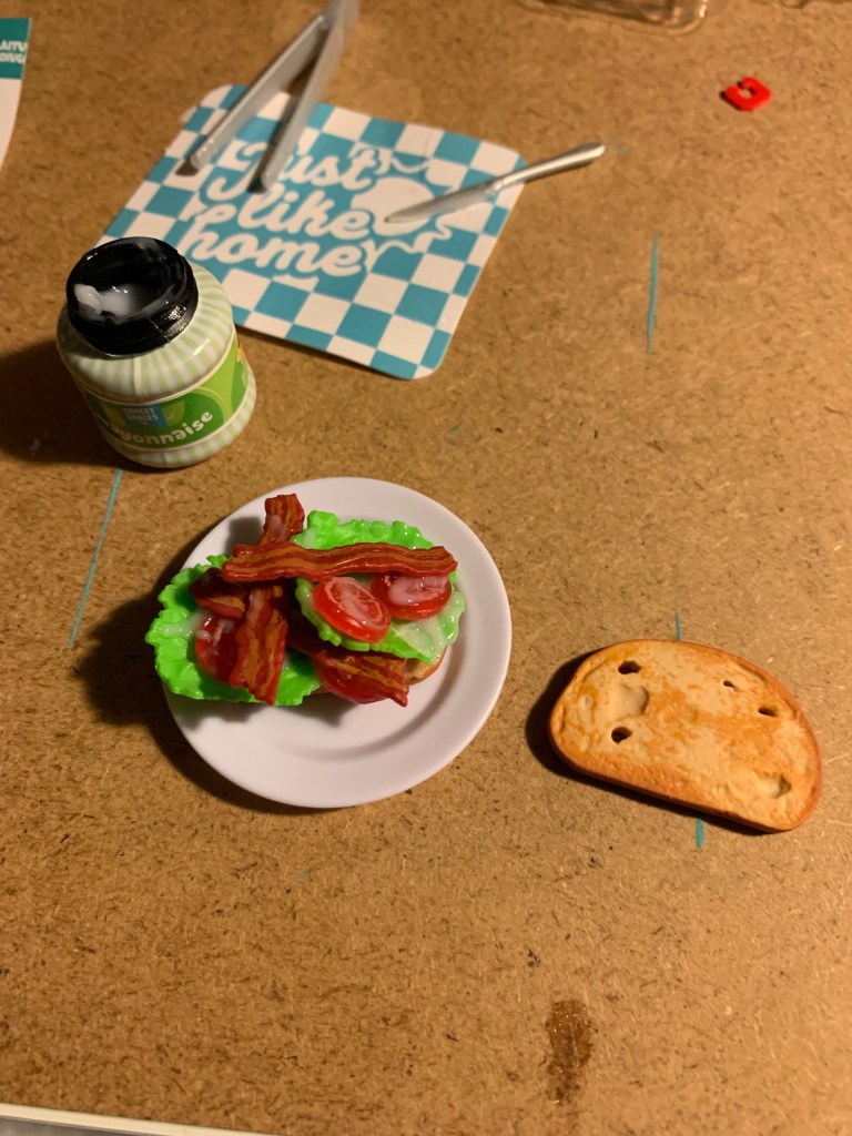 Since the mayo was under the lettuce and other ingredients though, it wasn’t getting the light needed to cure. I finally had to do this (above pic) where the mayo was spread over in globs to cure it to the other pieces.